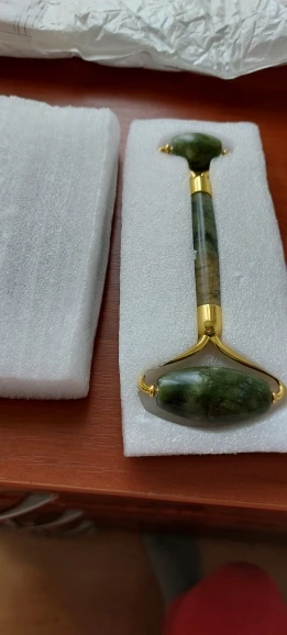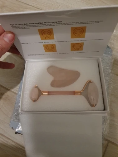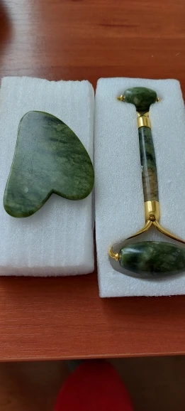 Massage Roller made of natural obsidian, has a pleasant cooling effect, like it very much. I didn't like the guasha very much, the scratch and if you hold it in your hands for a while, it heats up. Delivery 34 days, I will use the set with pleasure.